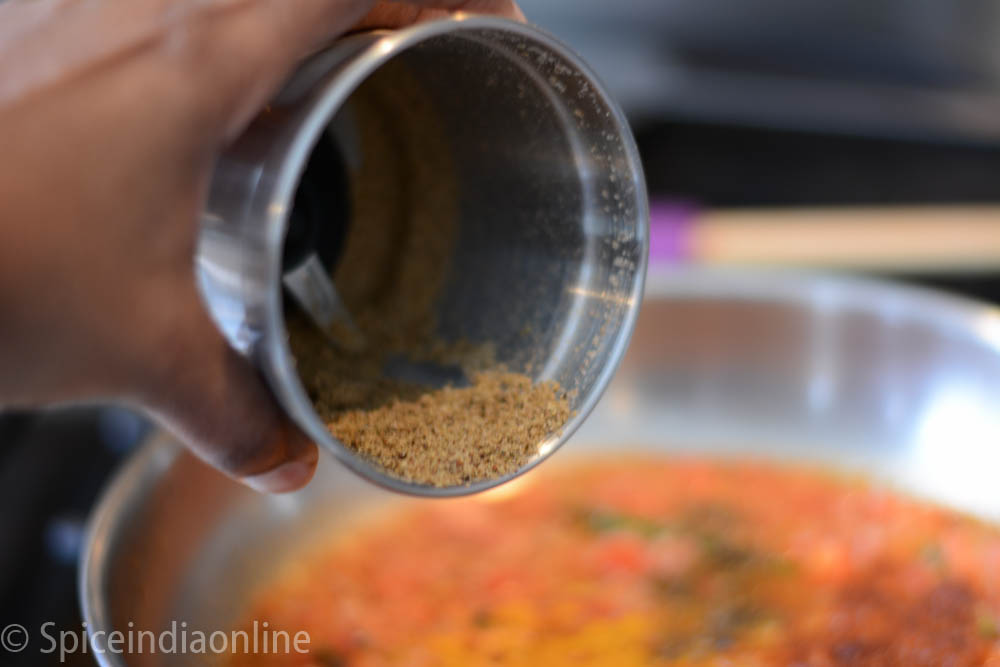 Add ground masala powder (Whole garam masala + Cashews).  Let it cook till the oil separates from the masala.