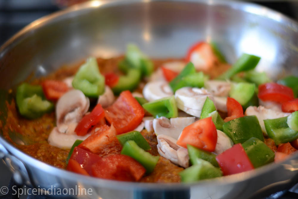 Clean your mushrooms and chop them into thin slices. Cut your bell peppers/Capsicums into thick chunks and keep aside. Grind your whole garam masala with cashews to a fine powder and keep aside.