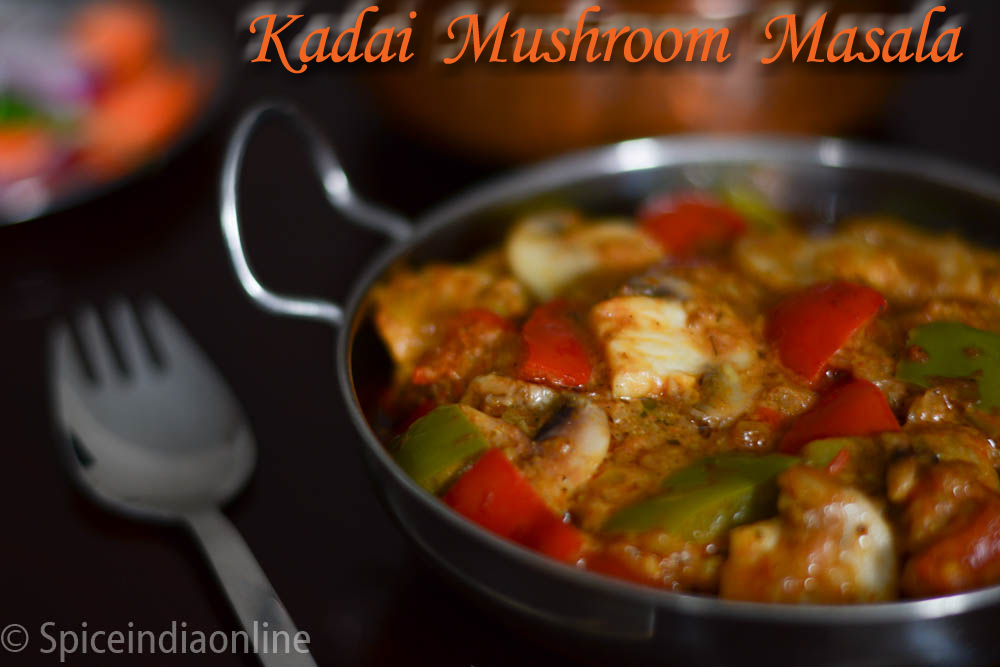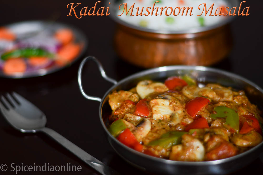 The recipe I wanted to share with you this week is a delicious, restaurant worthy, Kadai Mushroom Masala. This is one famous Punjabi dish cooked with small button mushrooms in rich tomato gravy with lots of spices and colorful bell peppers. It gets this unique name from the cooking vessel, similar to a wok, in which its usually made. It tastes fabulous with Fried rice, Pulao, hot chapatis or even flaky Parathas!