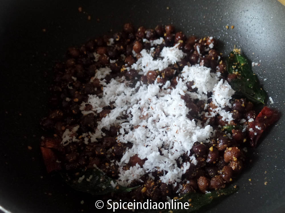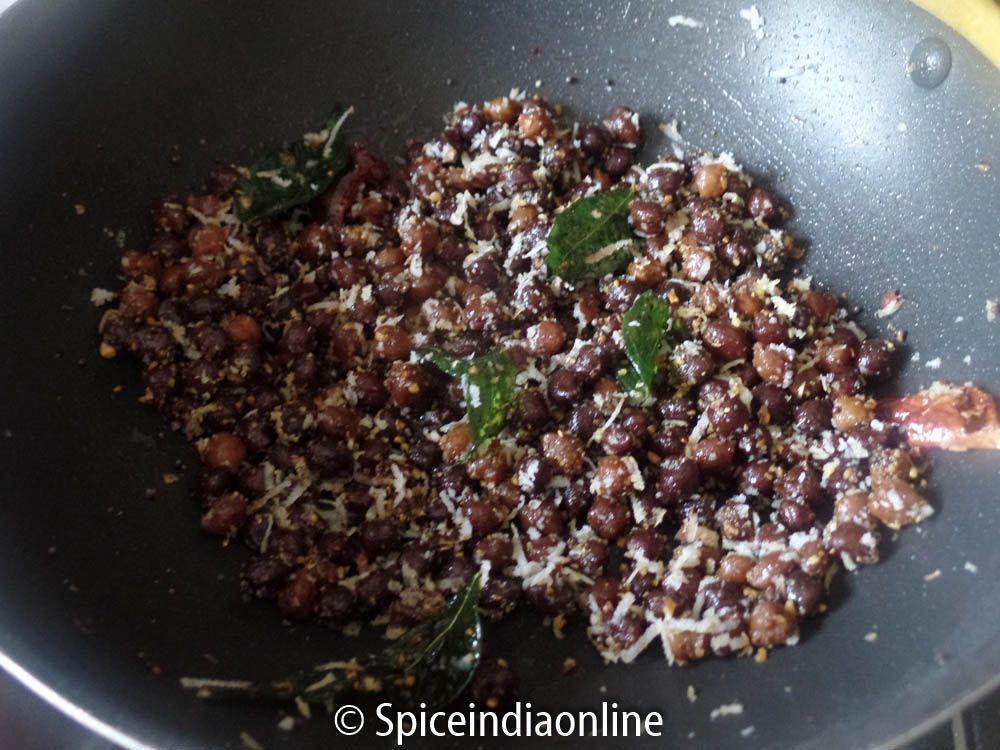Once cooked, open and rain all the water and set aside the  cooked channa. Heat oil in a kadai, splutter mustard and curry leaves, add in asafoetida powder. Now the cooked channa followed by sundal podi. Give it a quick stir fry and then switch off. Sprinkle with grated coconut to finish and mix to combine.