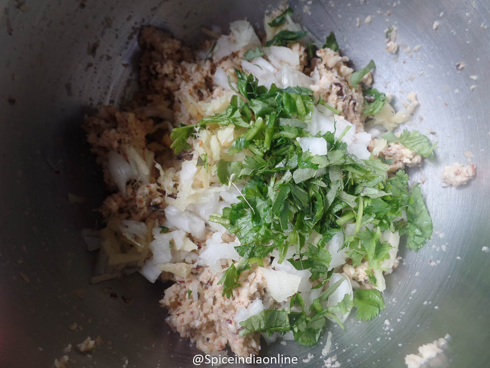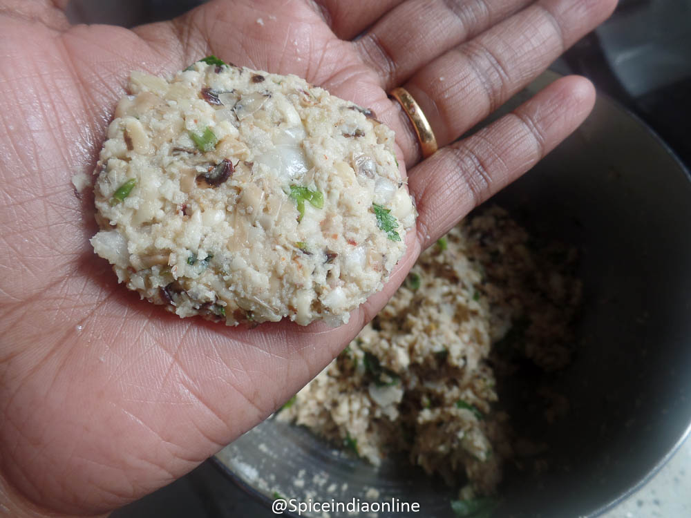 Chop all onions, ginger, coriander and curry leaves. Add them to the ground black eyed peas along with asafoetida and mix well. Take a small portion and flatten as shown in the shape of a masala vadai. Alternately you may also put a hole in the center like medhu vadai to cook them evenly.