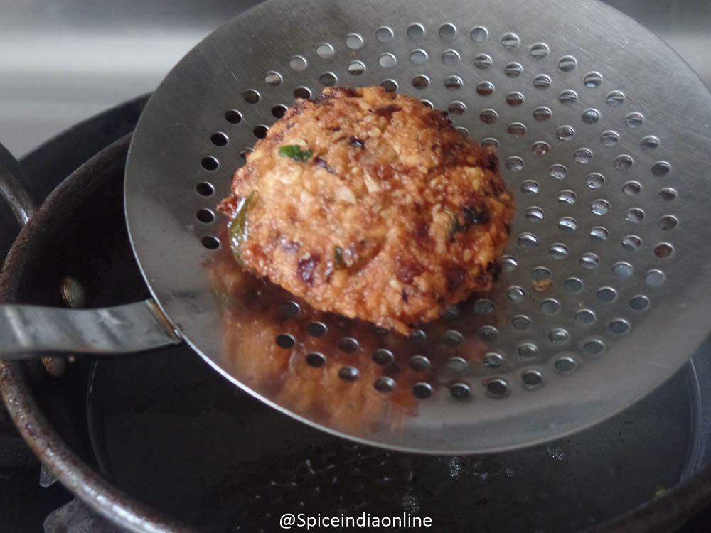 Heat oil in a kadai and start frying them in small batches till golden on all sides. Try frying them over low medium flame to avoid too much browning and to cook them thoroughly. Once done remove and drain excess oil by placing them on a paper towel. Serve them plain or with coconut chutney.