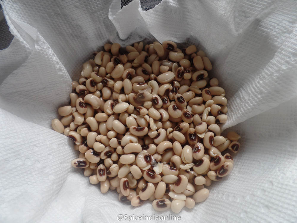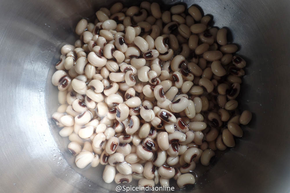 Soak black eyed peas overnight in water, in the morning rinse them completely with cold water. Put them in a colander to drain all the water. You may also use a paper or clean kitchen towel to drain excess water and keep them side.