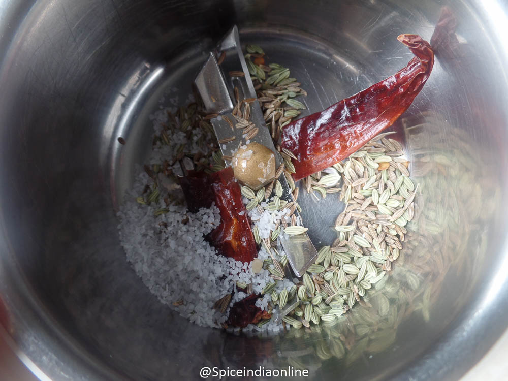 In a mixer jar, grind salt, cumin, fennel and dry red chili to a coarse texture. (use the pulse setting in your mixer a few times)