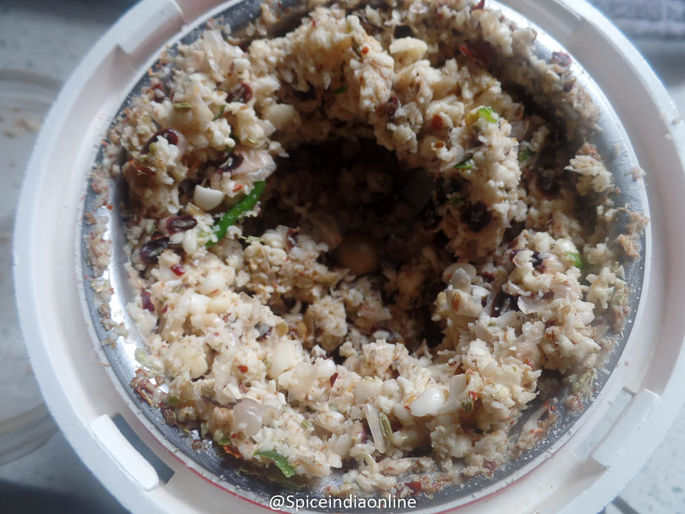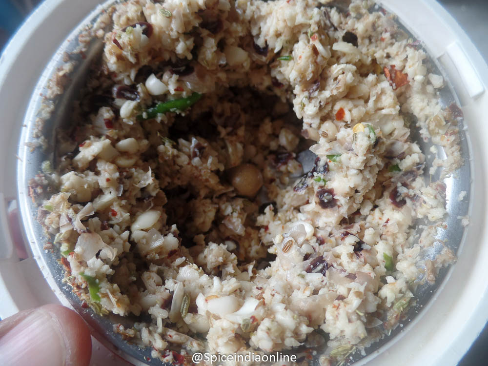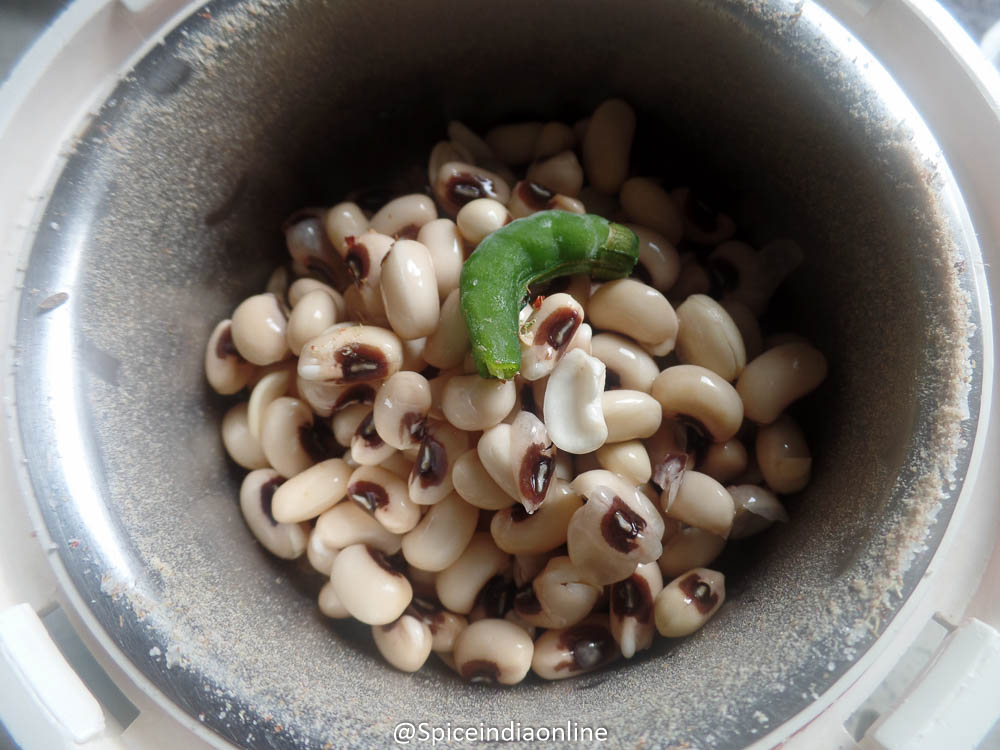 Now add the soaked black eyed peas/ karamani along with green chili to ground powder and pulse a few times. Again do not grind for a long time- just enough to make a coarse texture.