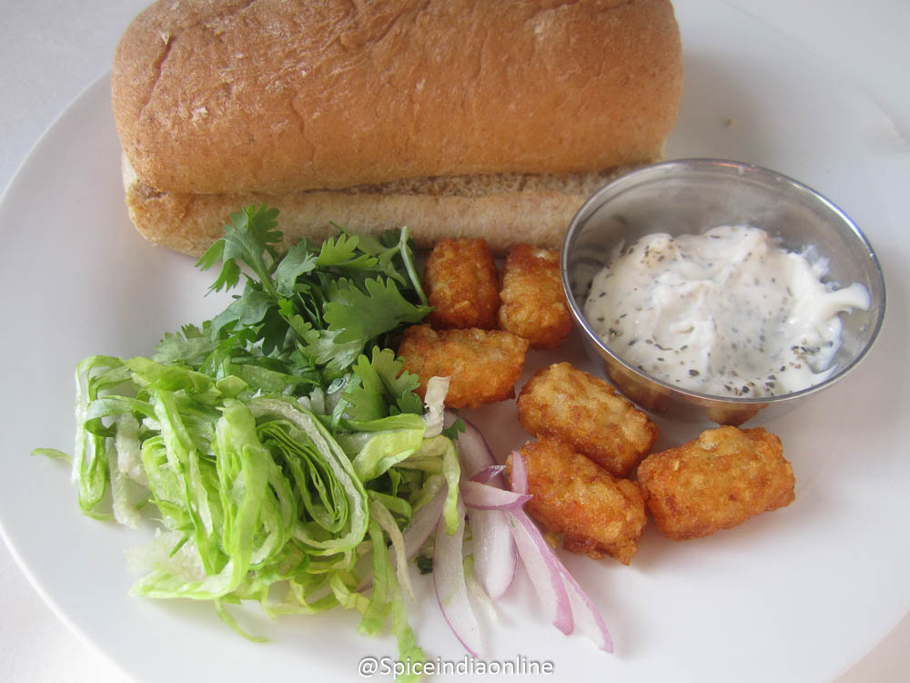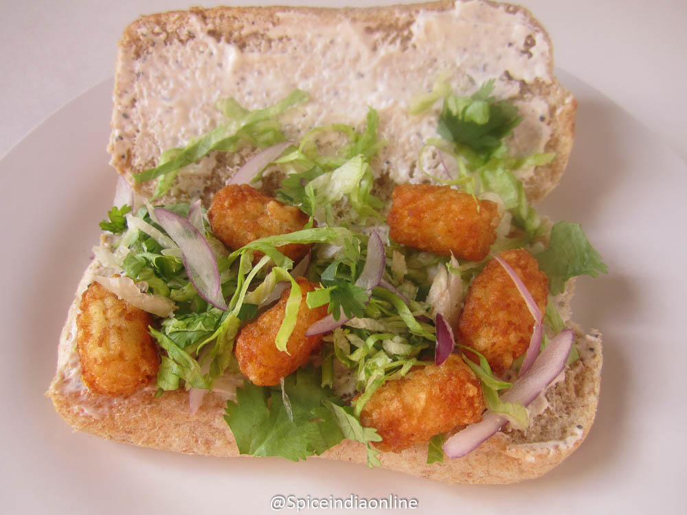 Cut open the bread roll, spread the cream cheese mayo on either side, arrange the lettuce, coriander and onions along with the cooked tater tots. Fold and cut in an angle.