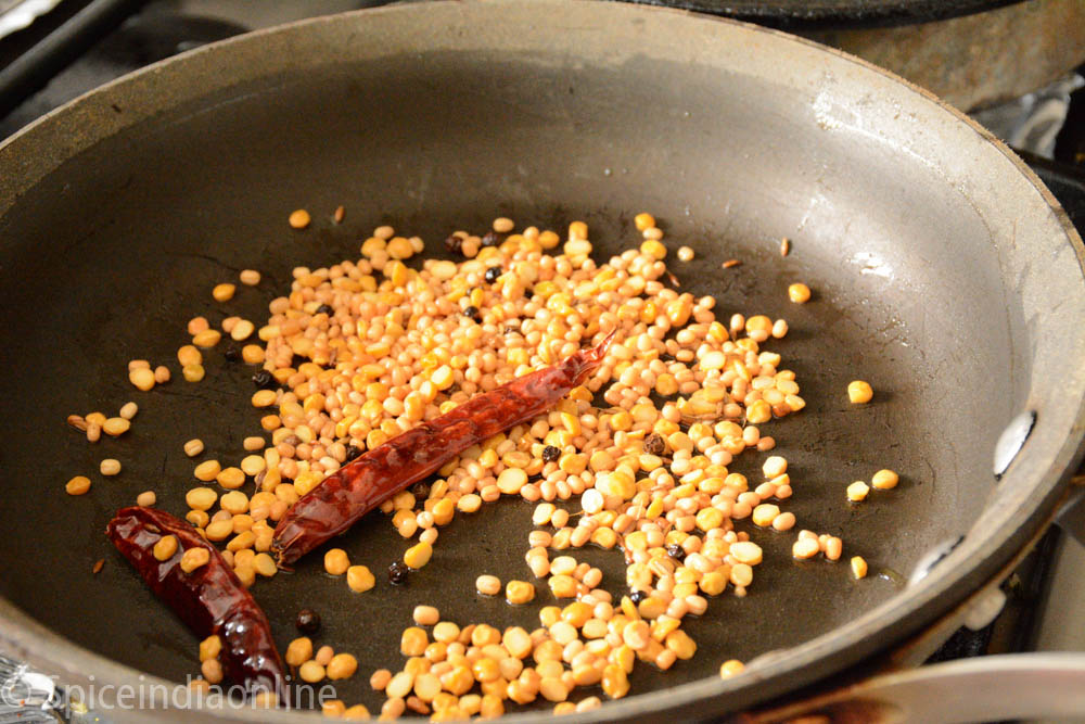 This powder is not always required but adding this really makes a difference in taste. Heat oil in a pan and start roasting the dry red chili, channa dal, urad dal, black pepper, cumin and fenugreek on low flame.