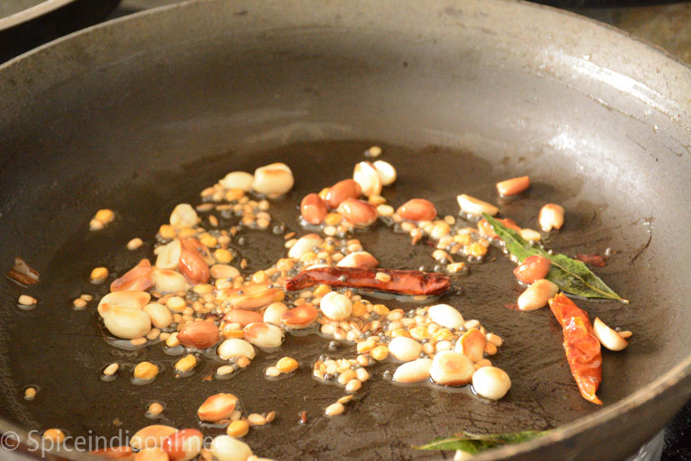Heat oil in a pan and splutter mustard seeds, the add channa dal and split black gram dal and roast them till red or golden followed by cumin seeds, dry red chili , roasted peanuts and curry leaves. Let them roast for few seconds then add turmeric, asafoetida and salt.