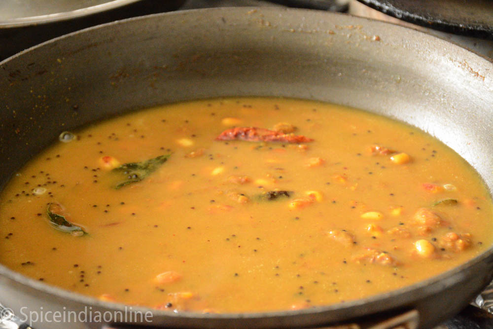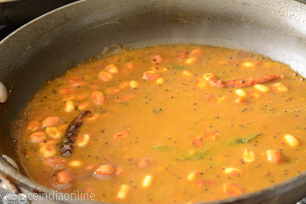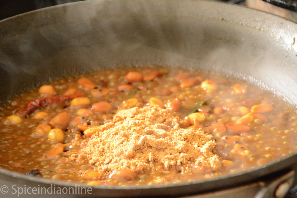 Now add the tamarind extract and cook over low flame until the raw tamarind smell disappears. This usually take about 15 minutes over low flame.