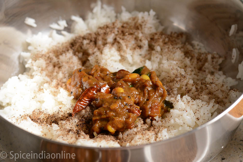 Take cooked rice rice in wide bowl, drizzle sesame oil on it, add about 3/4 of the pulikachal, one teaspoon of the black pepper powder, one teaspoon of the Puliyodharai powder and one teaspoon of salt. Gently mix to combine, take care not to make the rice too mushy.