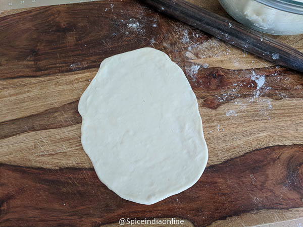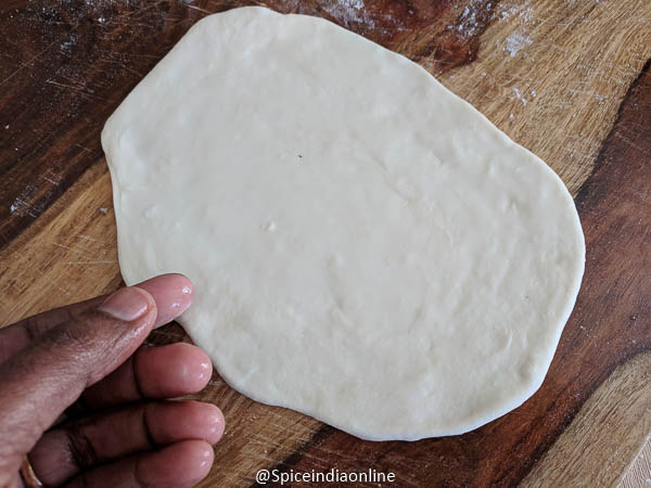 Divide them into 8 equal portions, dust with some maida and roll it out. Take one dough ball and roll out little elongated. You may dust with some flour to roll out and it will shrink as you roll. We are going to make a elongated triangle shape flat bread- shape is not that important, just play with it and make it your way! ( about 1/4 th of an inch thickness recommended)