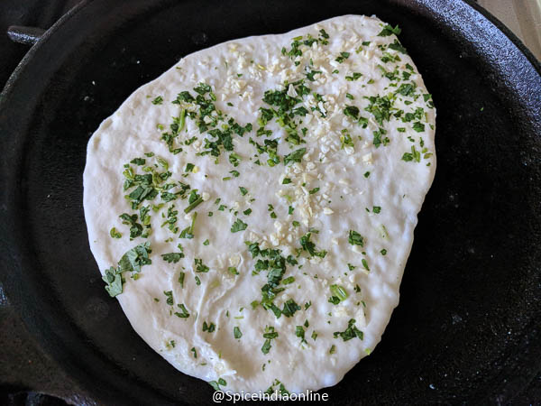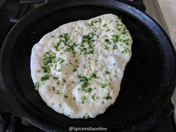Heat a good tawa with handle and keep it at medium flame. Make sure the tawa is hot enough before starting. Sprinkle some water to see it sizzle. Place the naan over the tawa with water side down. This will make the dough stick to the tawa.