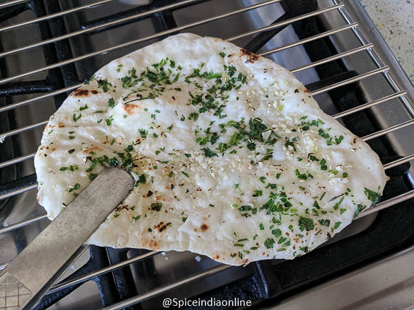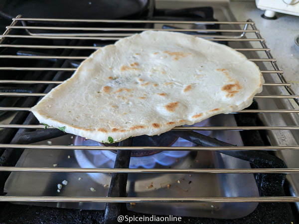 Use tongs flip the bread over direct flame like shown. I used my oven rack over the stove and place the bread over it. You may use a chapati grill or roti jari/ jali too. Cook over direct flame for few seconds until you get light brown spots.
