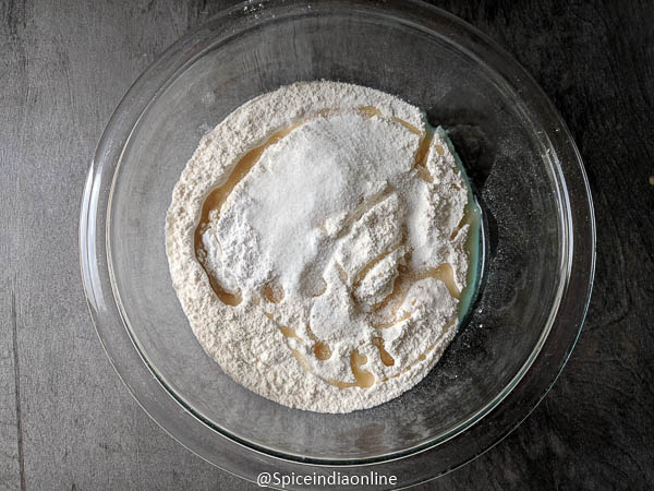 Combine maida, sugar, salt, baking soda, baking powder, oil and mix well.