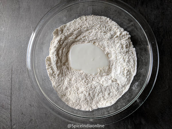 Now make a well and add in yogurt and start making a dough adding water. (It would probably drink 1 cup of water, do not pour all at once…. add little by little and knead)