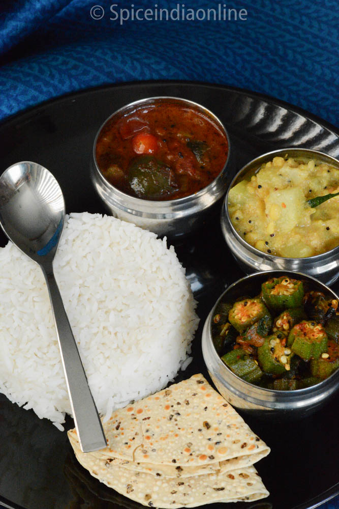 Chop all the basics like onion, tomato and chilies. Wash the ladys finger and chow chow- chop them into pieces. Soak tamarind for kuzhambu. First get the tempering done for kuzhambu, let all the onion tomato mixture cook on one stove. In a pressure pan combine chow chow & dal and cook for 2 whistles, once done get the tempering done and finish it. Now start the vendakkai curry by frying onion, tomato & lays finger along with all the masala. Let this slow cook while you work on the kara kuzhambu. Once the onion gravy thicken add the tamarind and other spice powder let that simmer till the oil separates. Get the rice cooked in a regular pressure cooker or rice cooker and slowly start the kitchen clean-up. By then the vendakkai (ladys finger) must be done, garnish and switch off. Finally all thats left is the appalam- you may either deep fry those and store in air-tight container or brush a drop of oil in a pan and place the milugu appalam and fry on both sides till you see little bumpy bubbles. Using a flat spatula try folding them like shown and remove from pan. Let it cool a bit then store in air-tight container. Serve this lovely lunch to your family!