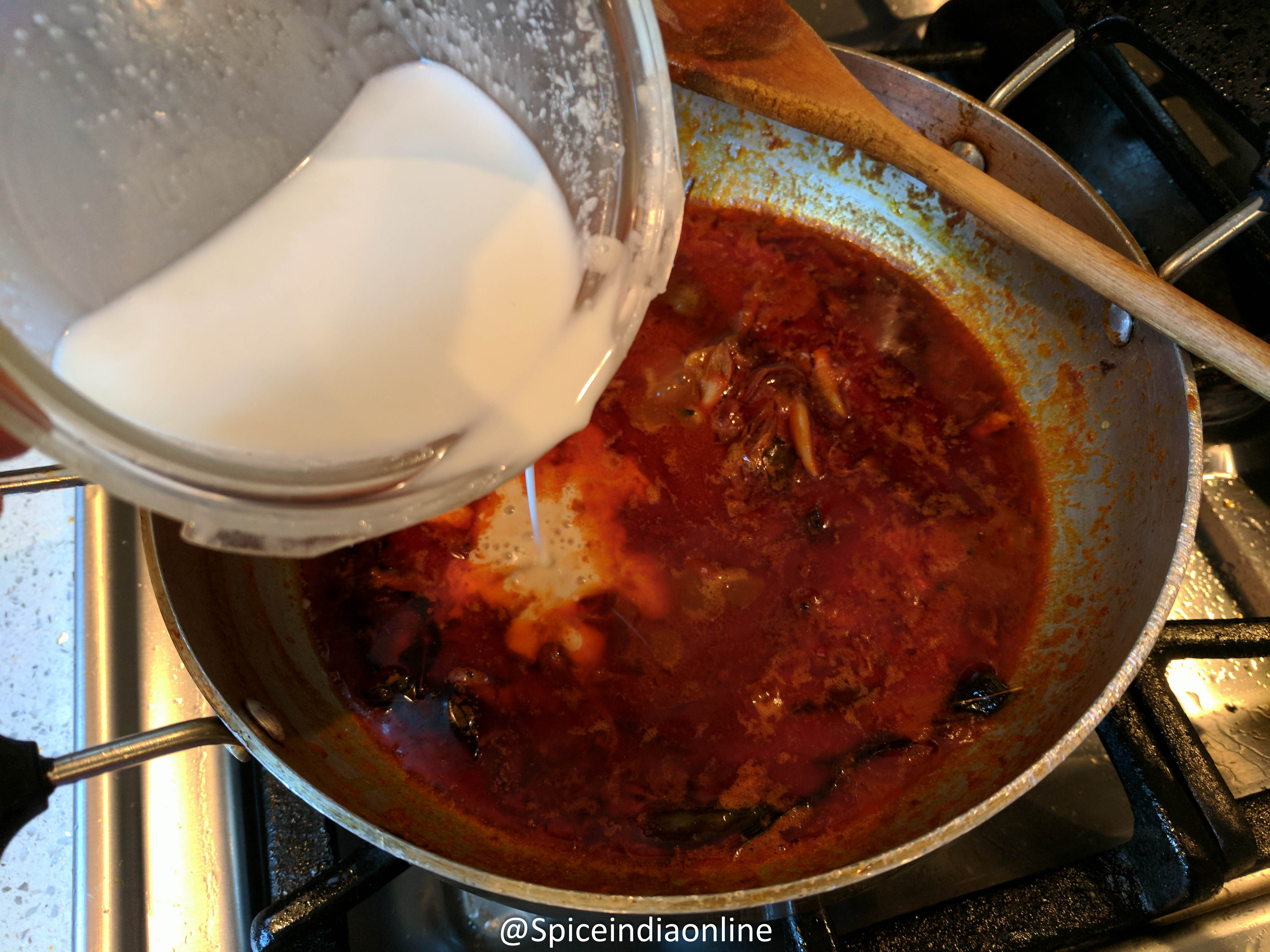Now reduce the flame to low and add in the thick coconut milk. From here on, keep the flame at low and simmer.