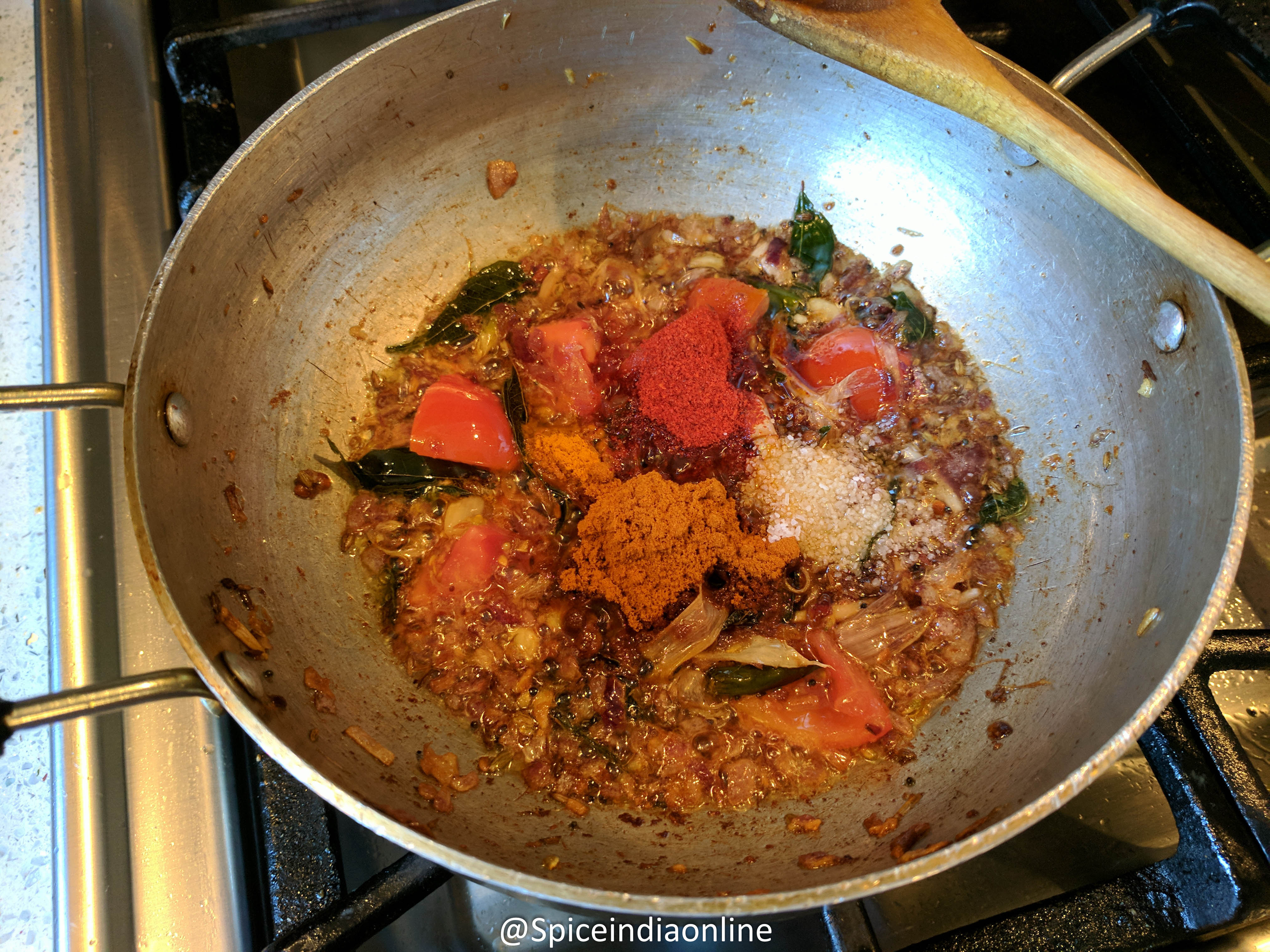 Now add in the turmeric powder, kashmir chili powder, coriander powder and salt. Saute well for few minutes.
