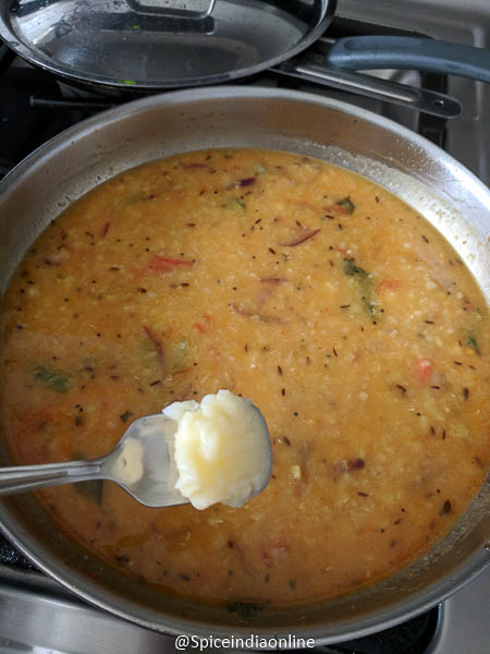 Now add in the cooked toor dal with 1/4 cup water and bring it to boil.