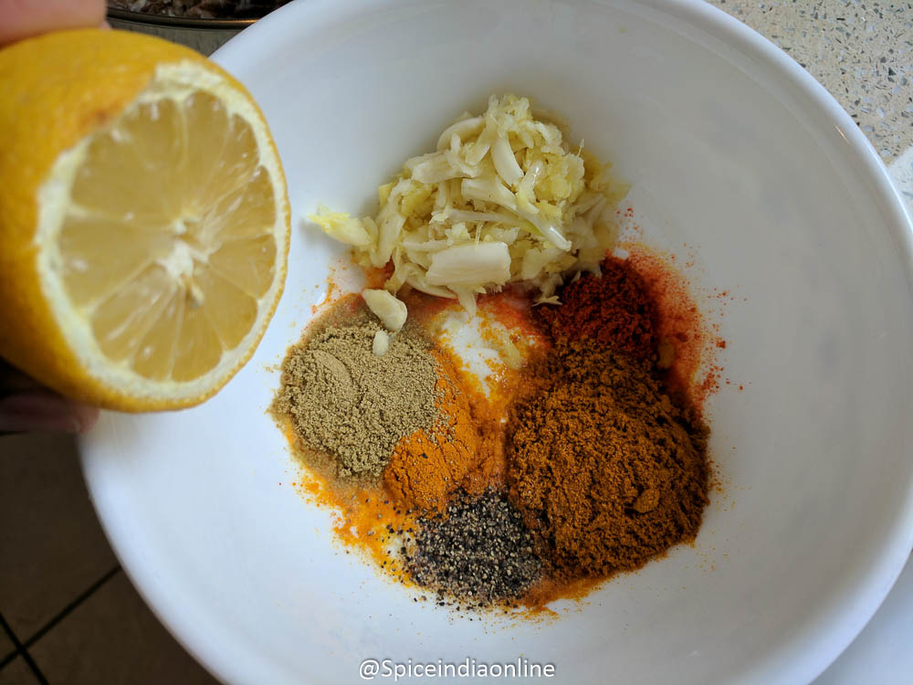Combine all the masala – turmeric powder, red chili powder, coriander powder, balck pepper powder, fennel seeds powder, crushed ginger, crushed garlic or paste , salt, yogurt and lemon juice in a bowl and make a thick paste.