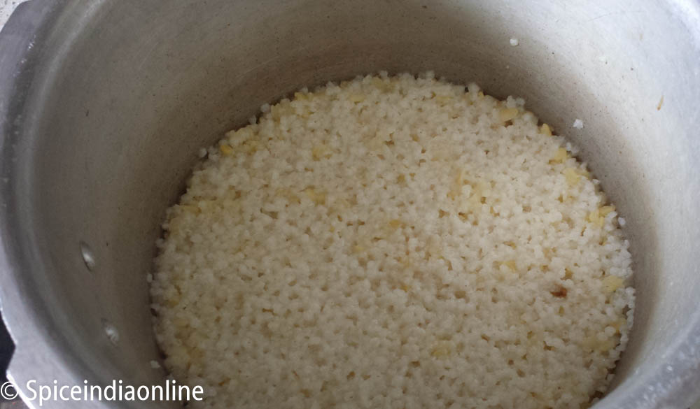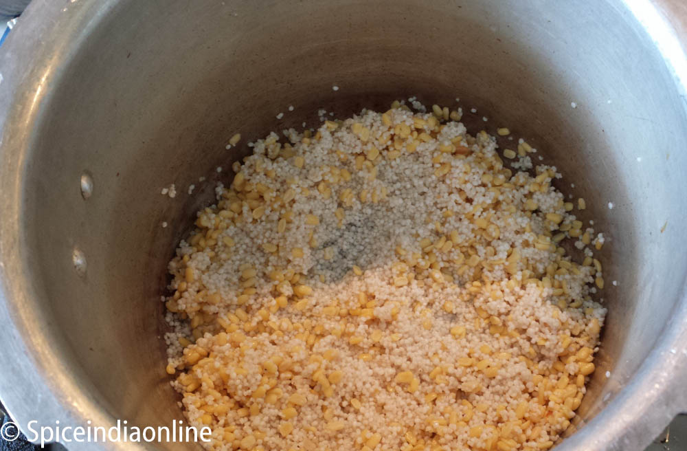 Kodo millet & Moong dal doesn’t require soaking. Moong dal when soaked or dry roasted for added flavor and good texture. . I usually soak moong dal for 20 minutes to get a mushy texture. Add both dal and millet to a pressure cooker pan.