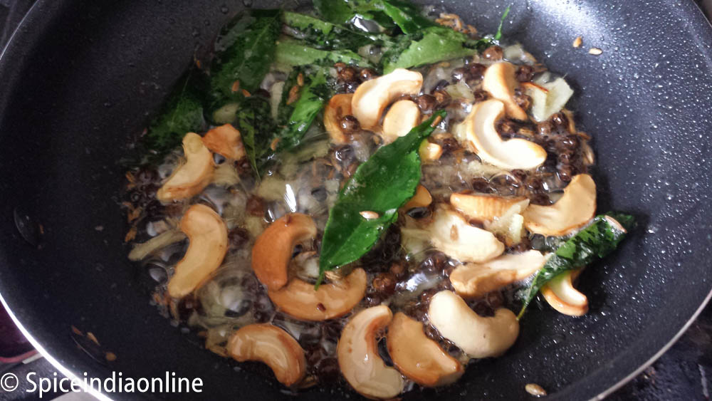 Meanwhile heat a small kadai or fry pan and heat the ghee, roast the cashews first to golden and then followed by cumin seeds, black peppercorns, ginger, asafoetida powder and curry leaves.
