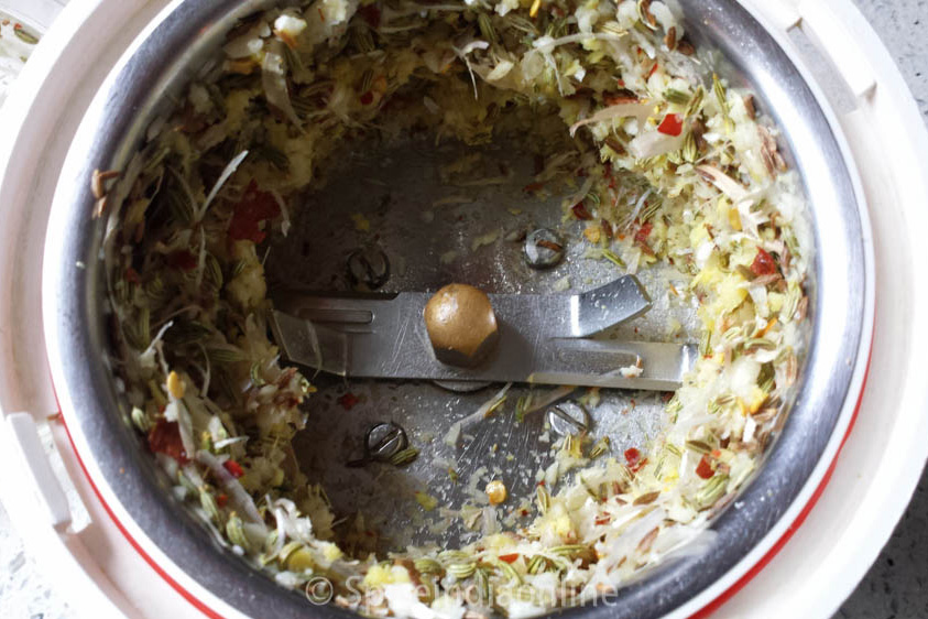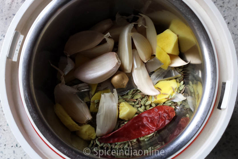 In a mixer jar, add dry red chili, ginger, garlic, cumin seeds & fennel seeds. Run on pulse a few times to just grin them. I like to add the garlic with the skin on for the sexy appearance… 😉
