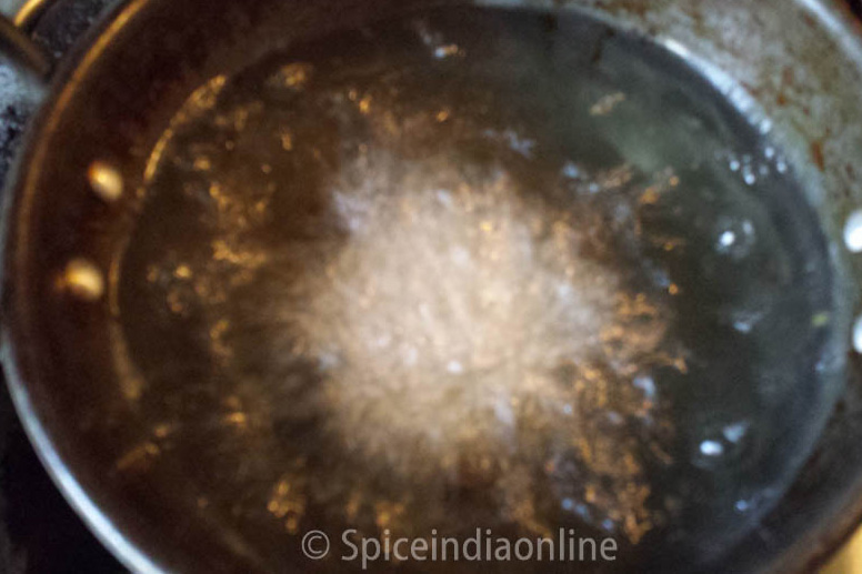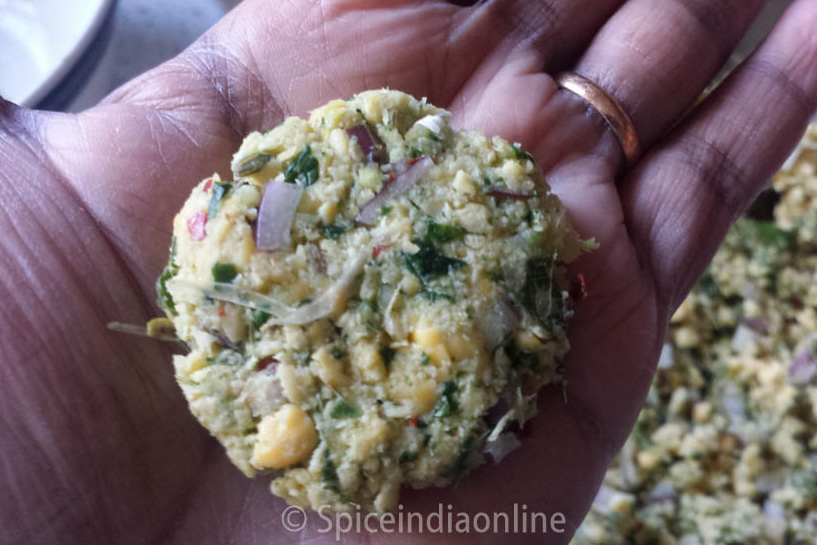 Pinch a portion, roll it like a golf ball and flatten it between your palm and gently drop into the oil from the sides of the kadai, without touching it.