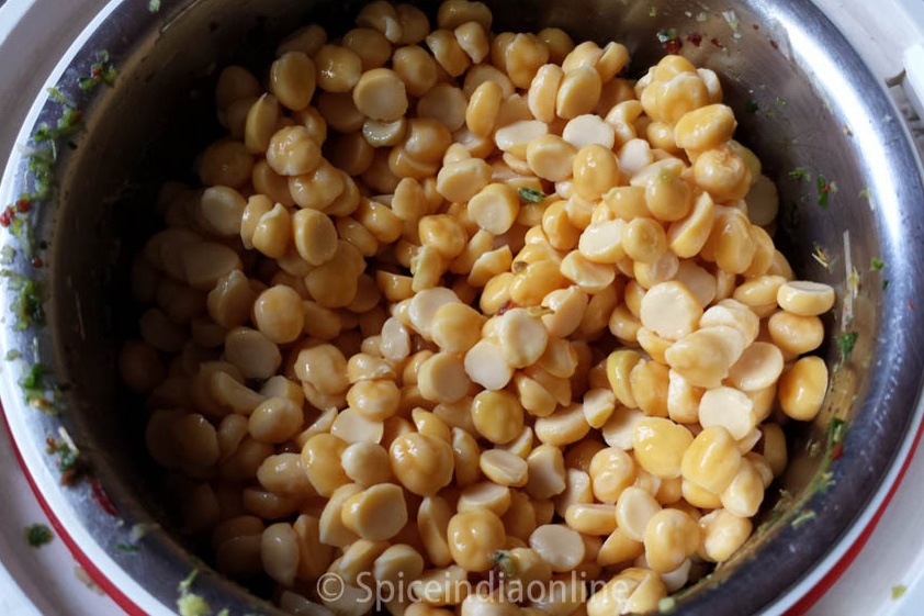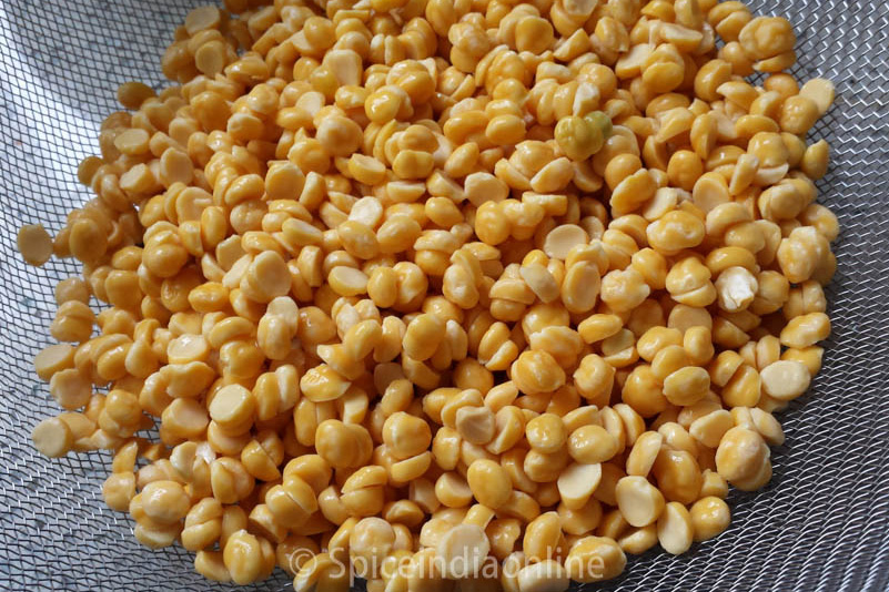 Soak Bengal gram for atleast 3 hours in enough water. Drain them in a colander like shown to take of the last bit of water on it. You may spread on a kitchen towel to drain off all the water. Let them sit for a while on the kitchen towel while you work on the other ingredients.