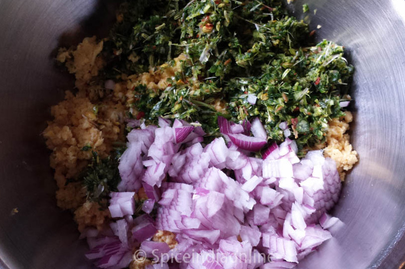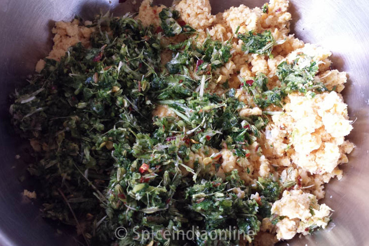 Transfer that mixture to a wide bowl, add the mint coriander mixture to it.