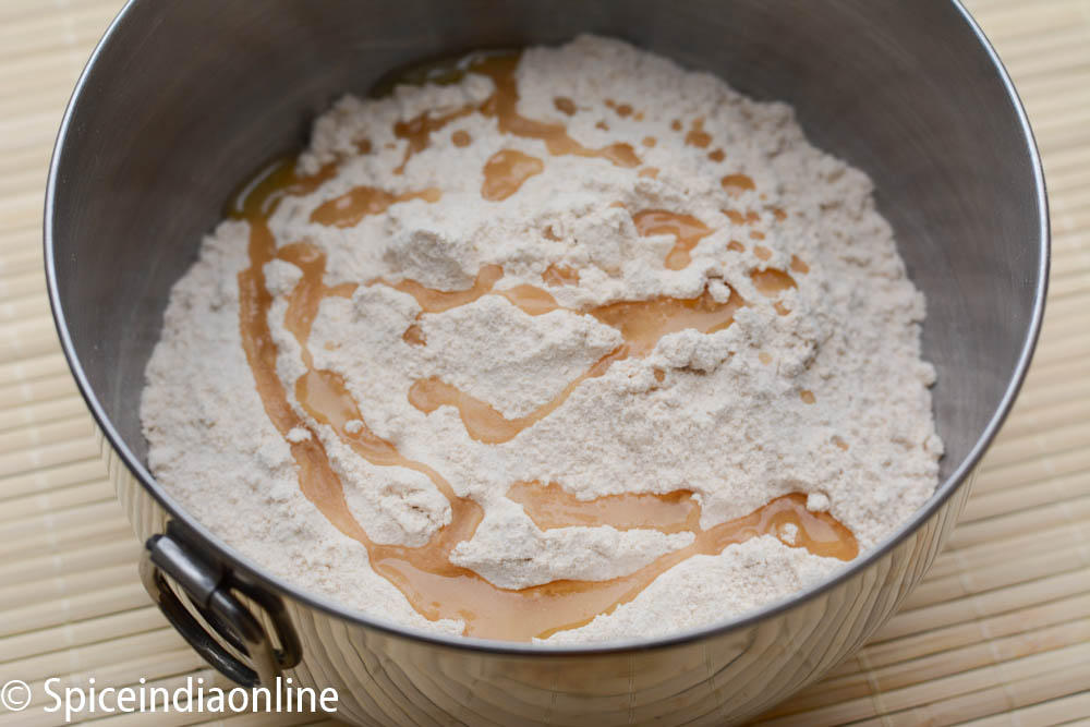 Sieve wheat flour and salt in a deep bowl. Drizzle ghee on top of it.