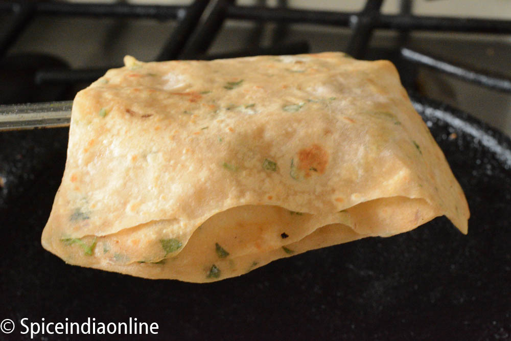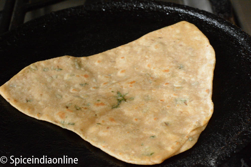 Heat a tawa or frying pan and toast the flat bread. Cook each paratha on the tava from both the sides until golden spots appear. Use little ghee or oil while toasting.