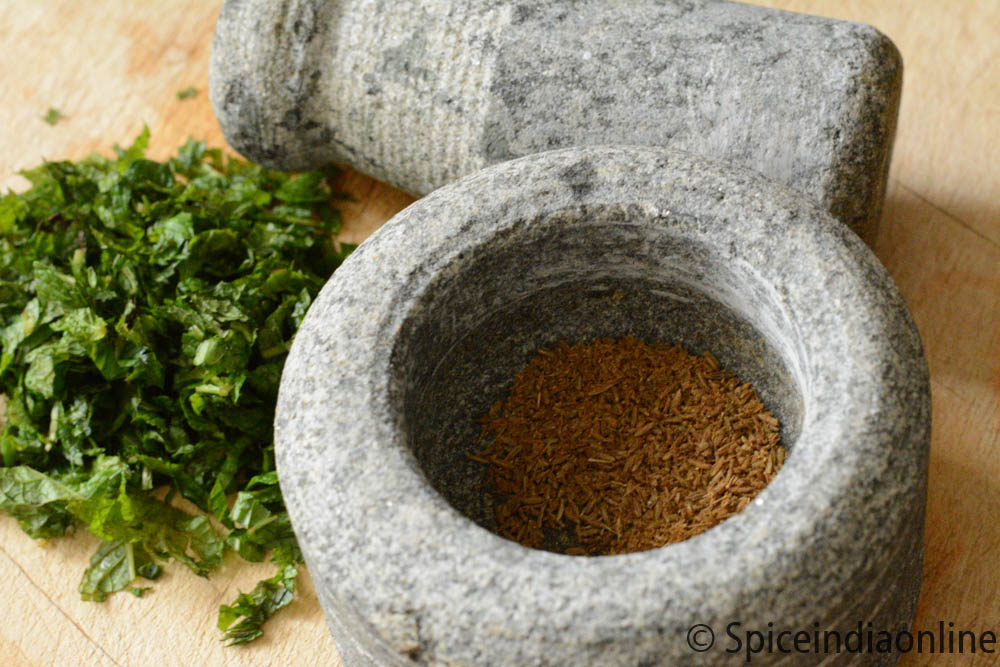 Add ground cumin seeds and chopped mint leaves to it. Mix well using luke warm water.
