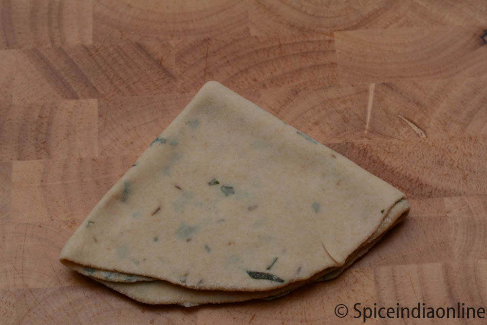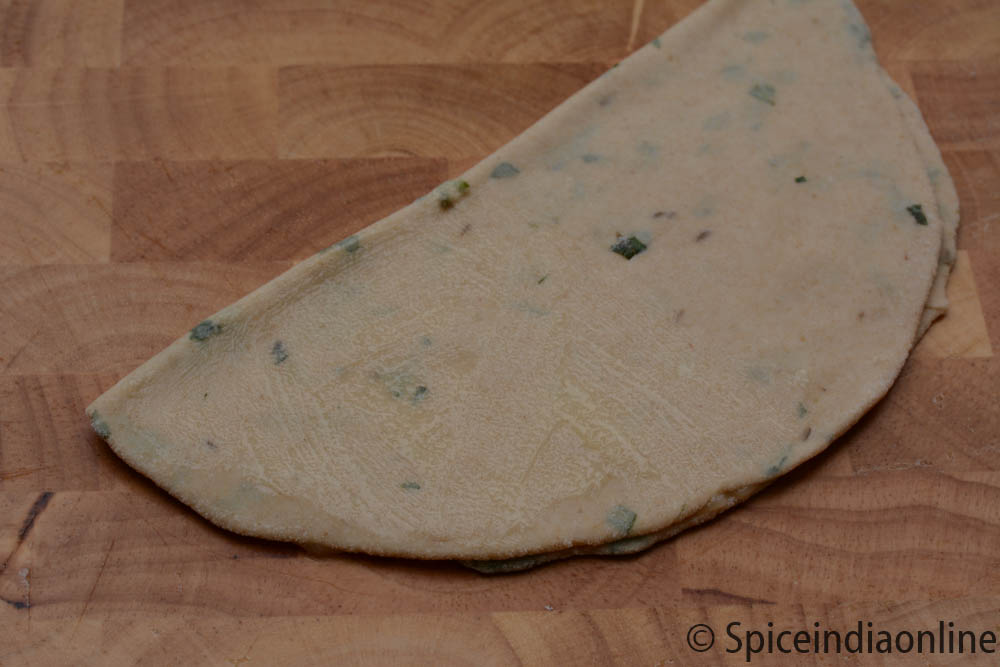 Fold into half as shown. Now again apply little ghee to one half of that fold.