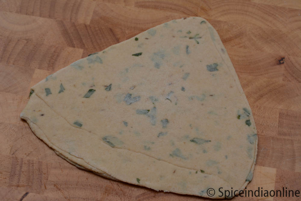 Dust some refined flour and start rolling out to make a triangular chapati.