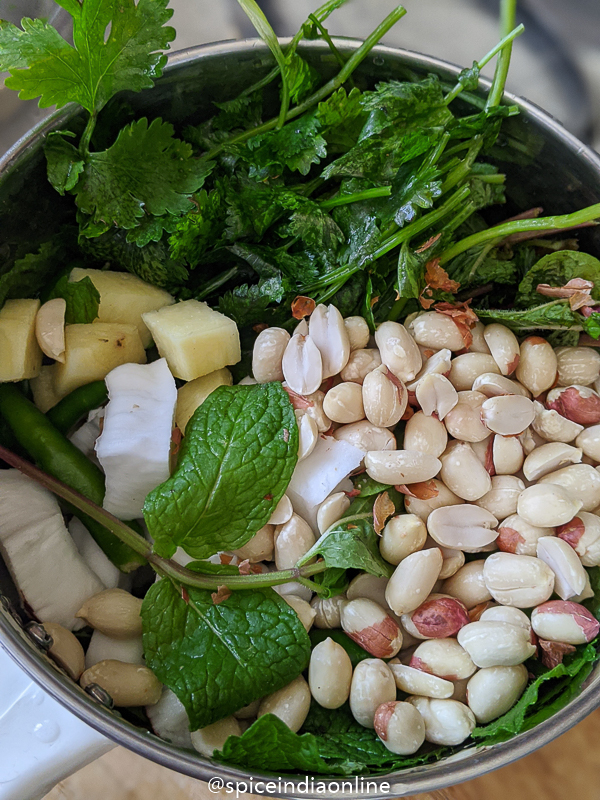 - Take mint leaves, coriander leaves, ginger, roasted peanuts, green chilli, tamarind, fresh coconut and salt in mixer / blender.