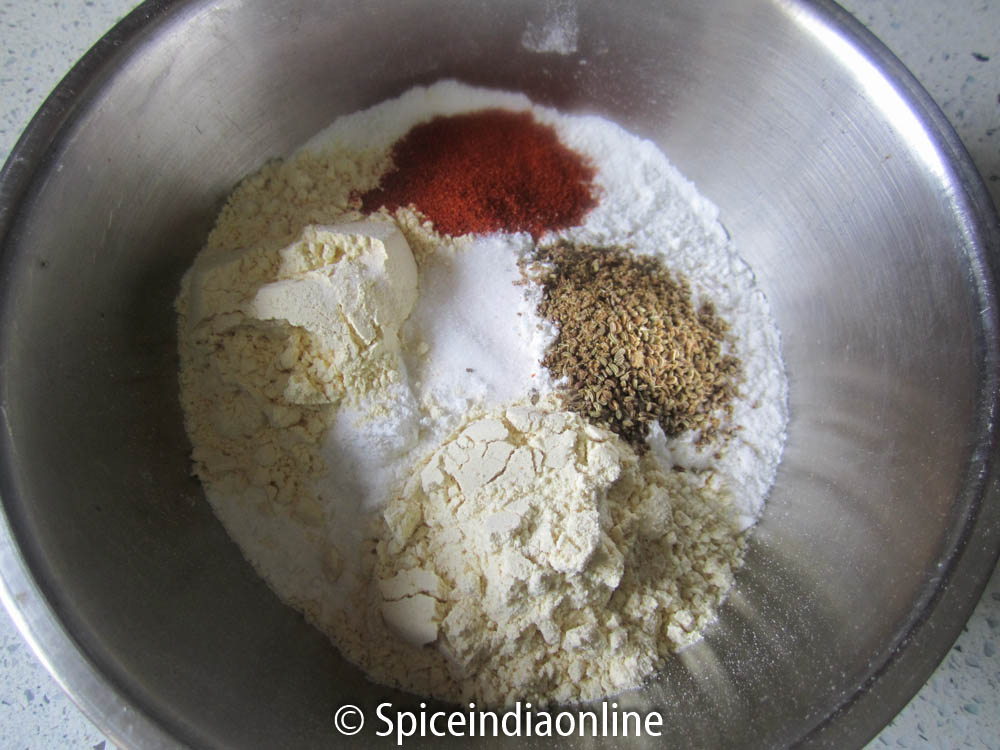 Then in a bowl combine rice flour, bengal gram flour, roasted gram flour, red chili powder, ajwain seeds and salt.Mullu Murukku