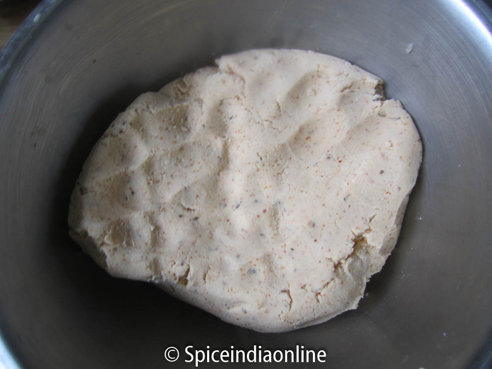 Now slowly add water, little at a time and gather to form a dough. Knead well to form a soft but stiff dough.Mullu Murukku