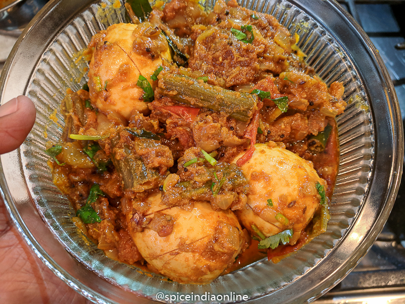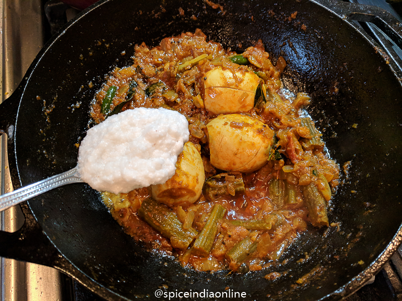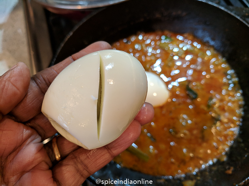 - Make little slits in the hard boiled eggs and add them to the simmering masala.