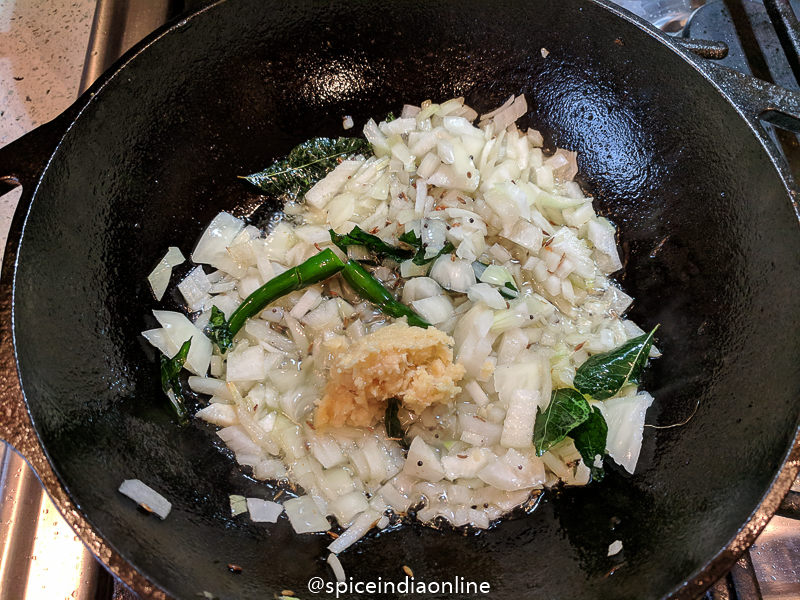 - Add in chopped onions, green chillies and ginger garlic paste. Saute them till the onions turn translucent.