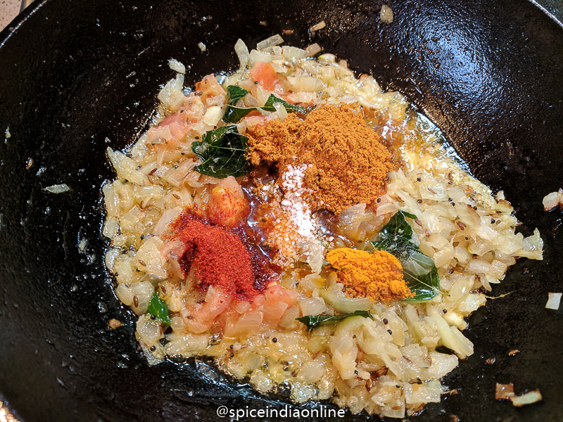 - Add in turmeric powder, red chilli powder, coriander powder and salt. Saute this till the masala powder blend well with the onion mix or till the oil separates.