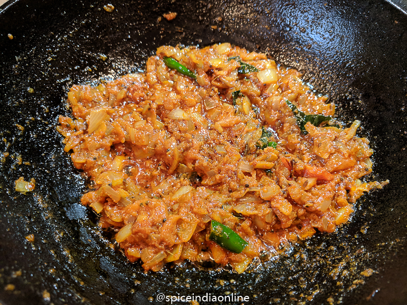 - Once the gravy thickens to a semi thick masala , switch off and garnish with coriander leaves.
