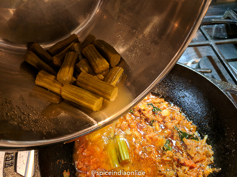 - Now add the cooked drumsticks along with its stock. Let the masala blend well with the cooked drumstick. Make sure you simmer over low flame and stir in gently without breaking the drumsticks.