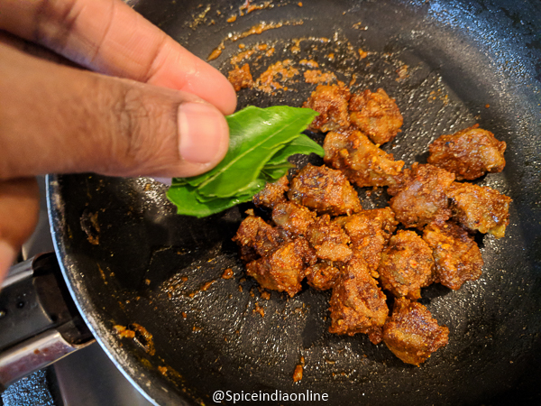 - Saute this until the meat gets coated with the masala… all the masala powder will drink up whatever mutton juice left and start becoming dry. Throw in a few curry leaves and slow roast…for 10 minutes.