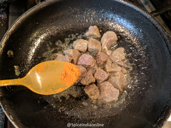 - Heat the cooked meat along with some stock… in a pan or kadai. Add in turmeric powder.