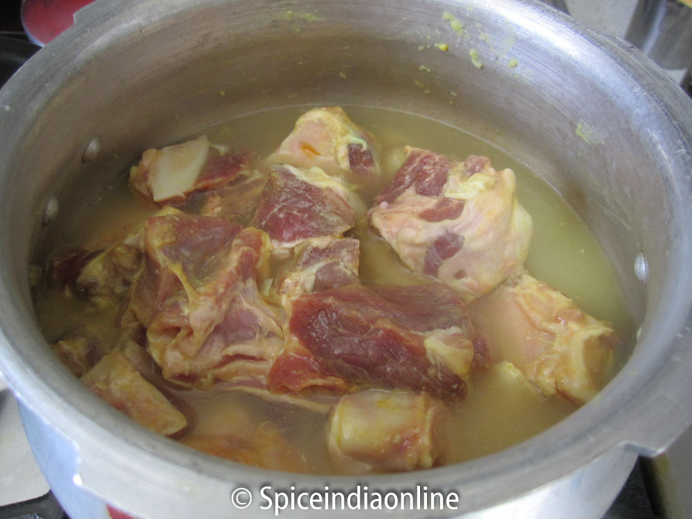 Finally lets start the gravy preparation. Pressure cooker the marinated mutton with enough water (about 4 cups approx) or just to immerse the meat. It may take about 3 whistles or 10 minutes in low- medium flame for a tender goat meat. If your meat is tough then 4-5 whistles recommended. Let the steam settle and set aside the mutton along with its juice.