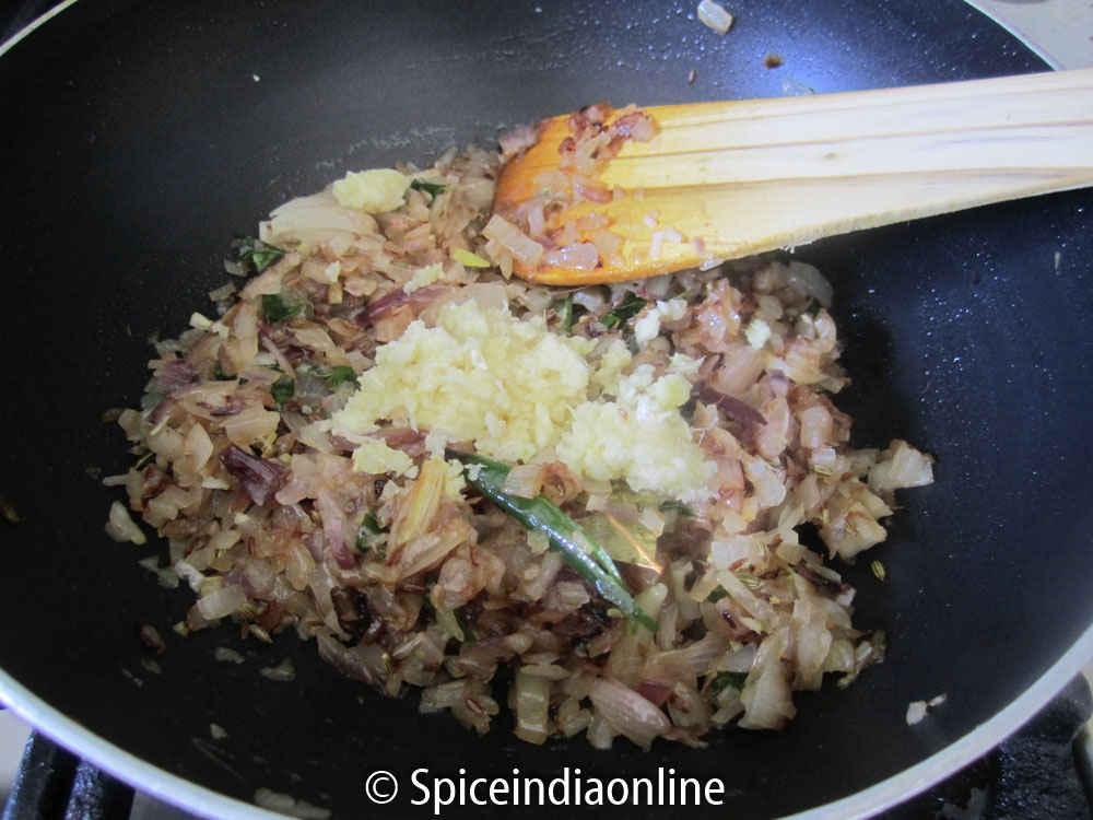 In a wide kadai or deep sauce pan, heat oil and sizzle the bay leaf. Add cumin seeds, fennel seeds and some curry leaves, let them dance along. Fry the chopped onions & green chilies till translucent. Brown them further if you wish to have your gravy nice and dark. Add in ginger garlic paste and fry along till the raw smell goes off.