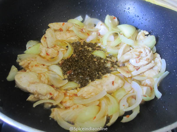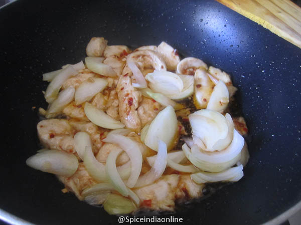 Add in sliced onions at this stage and stir fry.