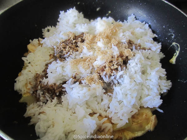 Now comes in cooked & cooled rice(long grain) along with kicap manis and palm sugar/ brown sugar. stir fry over high flame. ( you may add shrimp paste or belacan / dried shrimp paste, this is very strong so Caution 😳 add if you like or else substitute with few raw baby shrimps)