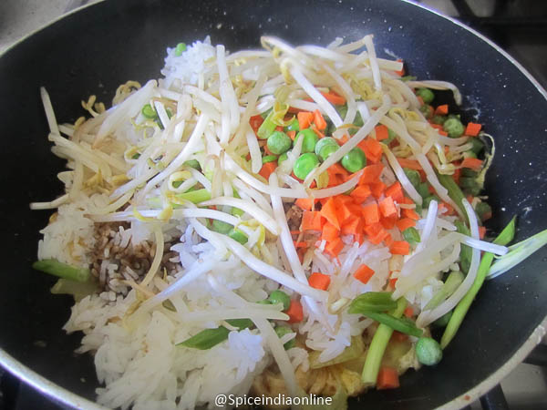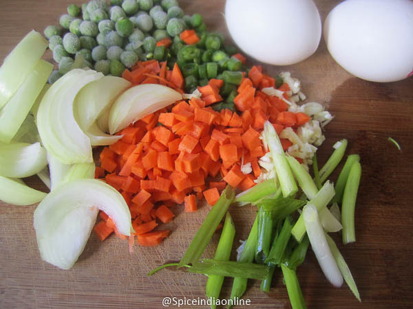 Veggies that you need… onion(thick slice), carrot diced, green beans chopped, peas and some spring onion. Egg ofcourse…